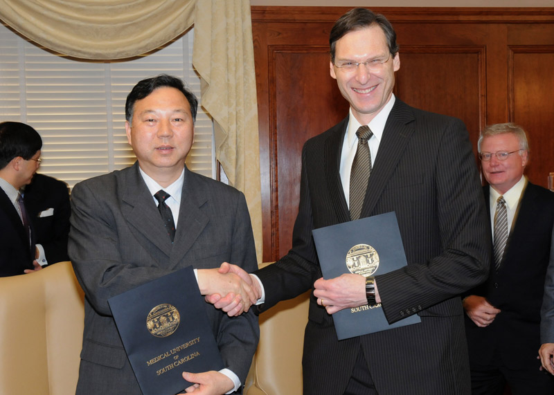 应美国南卡罗莱纳医科大学(Medical University of South Carolina)校长Raymond S. Greenberg先生的盛情邀请,学校陈子辰常务副书记,医学部罗建红常务副主任、黄河副主任、王建安副主任、何超副主任等一行6人代表团,于2011年4月12、13日成功访问了美国南卡罗莱纳医科大学。