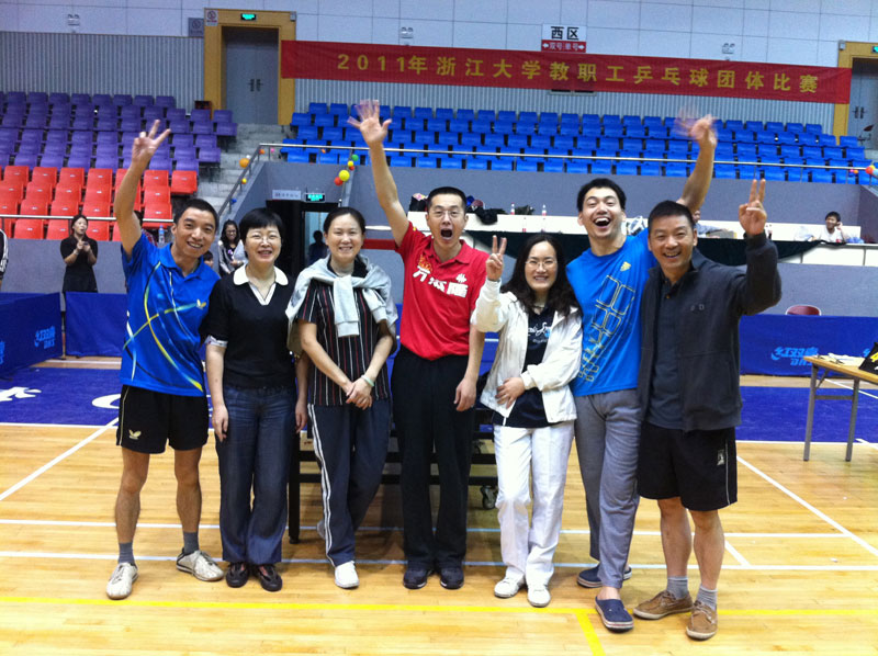 10月14日晚,2011年银河线路检测中心教职工乒乓球团体比赛在浙大玉泉校区体育馆精彩开赛,共有32支代表队亮相本次大赛。医学部首次以统一的院级队参赛,派出一支包括领队王亦夫,教练胡济安,队员胡济安、孙亚逊、李俊、郭春雷、高丽娟、李松英、谢珏在内共八人的精英队伍角逐比赛,凭借出色的球技与得当的战略,勇夺冠军。