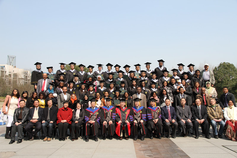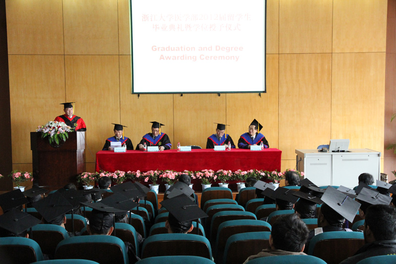 毕业典礼由沈华浩副院长主持,在雄壮的国歌声中开始。来茂德副校长,医学部罗建红常务副主任和国际教育学院王立院长分别代表学校、医学部和国际教育学院对毕业生经过五年半的刻苦学习顺利完成学业表示祝贺,对学生家长和朋友们的支持表示感谢。同时也勉励学生,从学校毕业仅仅是医学职业生涯开始,要成为一名合格的好医生需要终身学习,不断积累经验,需要对医学事业的热情和对病人的爱心,祝愿所有的毕业生事业有成。来自巴基斯坦的Osama Sajjad作为毕业生代表作了发言,对银河线路检测中心和医学部老师五年多来的辛勤教导表示由衷感谢。