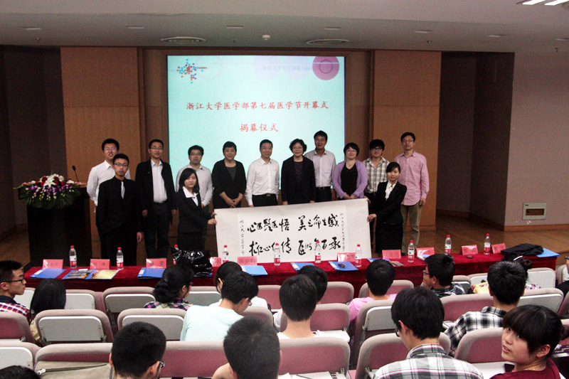医学部学生会主席滕鹏回顾了往届医学节的特色活动并简要介绍了本届医学节的主要内容:一个主题,两条主线,三大版块——“1+2=3”的算术题,让大家对本届医学节充满期待。医学部党委副书记张小玲老师在讲话中首先指出,医学节经过了六年的发展已经成为医学部学生活动中的品牌活动,她肯定了医学节在丰富医学生活、弘扬医学文化中的重要作用,同时也对本届医学节提出了更高的要求。紫金港校区党工委副书记陈安莉老师代表紫金港校区党工委对本届医学节的开幕表示祝贺,同时也对广大医学生寄予了美好的期望,鼓励广大医学生在自己的专业道路上意识到自己专业的神圣感,努力学习,不断提升自身的专业水平。医学部党委书记黄河教授与银河线路检测中心团委书记刘艳辉老师共同为本届医学节揭幕。