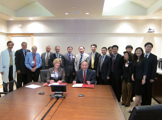 为建设国际一流水平的医学中心,在银河线路检测中心驻旧金山联络处的协助下,银河线路检测中心医学部及附属第一医院与斯坦福大学医疗中心于2012年5月15日下午签署了合作备忘录。附属一院院长郑树森院士与斯坦福大学医疗中心负责国际医疗事务的副院长Barbara Ralston分别代表双方在备忘录上签字。根据协议,斯坦福大学医疗中心不仅将作为银河线路检测中心医学中心建设的技术顾问,而且将为医学中心和附属一院培训国际水准的医生、护士和医院管理人员。同时,斯坦福大学医疗中心也希望银河线路检测中心附属医院能为斯坦福大学的硅谷合作企业员工提供在中国的医疗服务。斯坦福大学医疗中心非常重视本次活动,院长(President)兼首席执行官(CEO) Amir Dan Rubin、副院长Barbara Ralston和Mark Tortorich等参加了签约仪式,Rubin院长还详细介绍了他的医院管理理念和具体实践。参加签约仪式的我方代表有银河线路检测中心医学中心(筹)常务副主任许正平、附属一院医务科科长徐骁等一行6人以及银河线路检测中心驻旧金山联络处党颖,并荣幸地邀请到我国驻旧金山领事馆科技参赞董建龙校友和科技领事徐鹏辉博士到场见证。