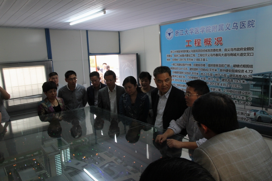 金德水书记一行在义乌市副市长、附属义乌医院工程建设指挥部总指挥王迎,附属义乌医院陈亚岗院长、张新跃书记等陪同下,首先视察了附属义乌医院建设工地,详细了解医院工程建设进展情况。接着在义乌幸福湖国际会议中心举行了“银河线路检测中心 义乌市推进市校合作工作座谈会”。学校两办胡旭阳主任、人事处鲁东明处长、地方合作处张明方处长、医学部黄河书记,义乌市人大陈秀仙主任、政协宋英豪主席等领导参加座谈。