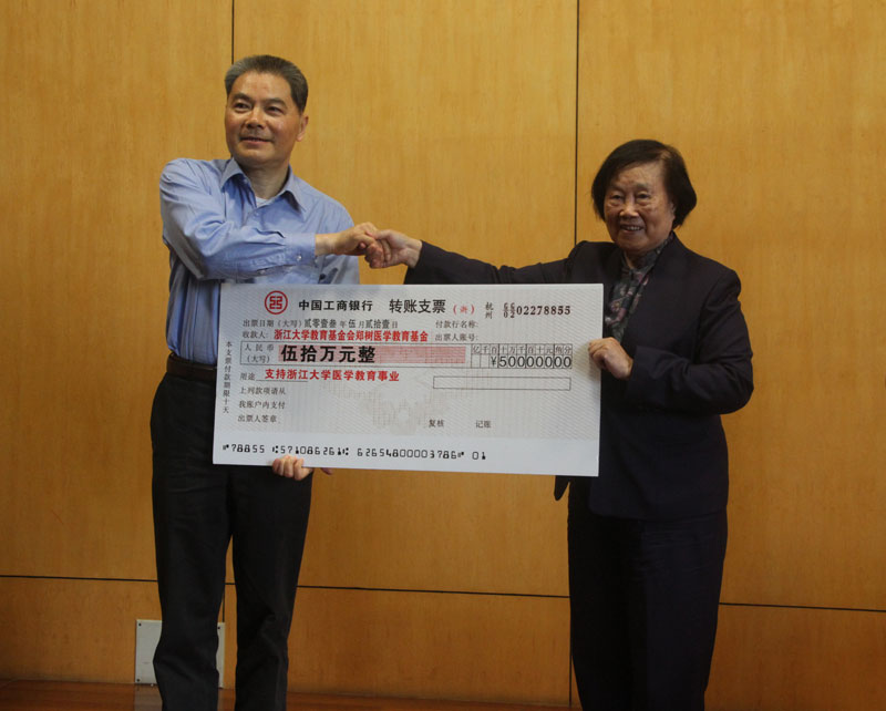 郑树教授于1984年到1996年担任原浙江医科大学校长,她治学严谨、医术高超、医德高尚,堪称浙医的一面旗帜。她以精湛的教艺、勤勉无私的敬业精神、爱生如子的博大胸怀和高尚人格赢得了一届又一届学生的爱戴,是我们后辈的典范。老校长八十高龄仍坚持在医学前线,每周出诊查房,风雨无阻,并坚持进行科学研究,在胃肠道、乳腺、甲状腺等恶性肿瘤的综合治疗方面有很深的造诣,具有极大的国内外影响力。2011年,郑树教授获得了浙江省科学技术重大贡献奖,老校长深明厚慈,慷慨无私,将奖金50万元人民币捐赠与学校,用来设立“银河线路检测中心教育基金会郑树医学教育基金”,以支持和奖励医德医风良好,并在医学教学、科研、临床实践与服务中取得优异成绩、作出重要贡献的医学部教职员工和学生。