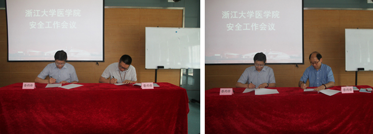 陈智代表学院与基础医学系、公共卫生系签订“安全责任书”,并作了总结发言,提出学院师生一定要把安全生产放在第一位,要求每个实验室都能做到新手岗前培训,培训合格再上岗。