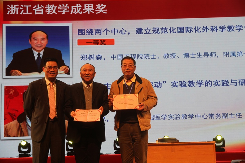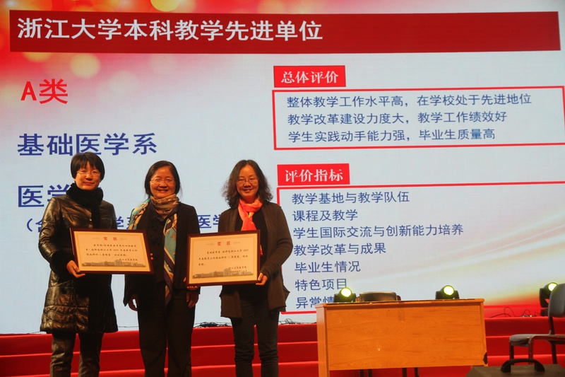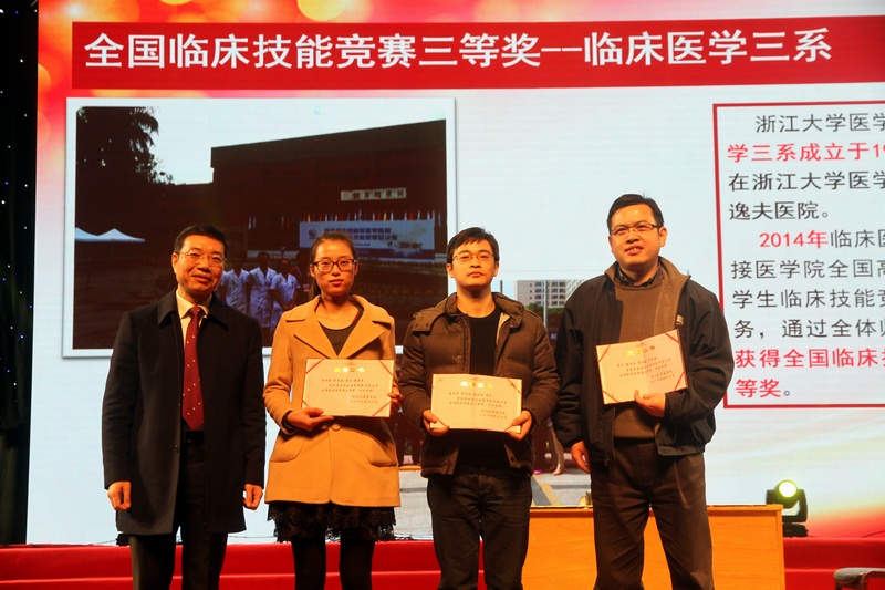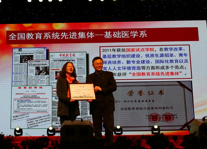 晚会在基础医学系研究生新生的大合唱中开始,一首《歌唱祖国》激扬红色梦想、瞬间点燃现场热情。在回旋的乐曲声中,院长段树民以“我更想站在一个看得到你们的地方说几句”开场的致辞,感动了现场所有师生。随后,主持人宣布银河线路检测中心教育工作表彰之教学工作表彰正式开始。基础医学系一马当先,获得2014年全国教育系统先进集体荣誉称号。来茂德等7人因担任2014年教育部、卫生和计划委员会规划教材主编、副主编分别获得表彰。临床医学三系走结合“医、教、研”的道路,获得全国临床技能竞赛三等奖。郑树森、陆源分别获得浙江省教育成果一、二等奖,基础医学系、银河线路检测中心(临床医学系和口腔医学系)双双获得银河线路检测中心本科教育先进单位。