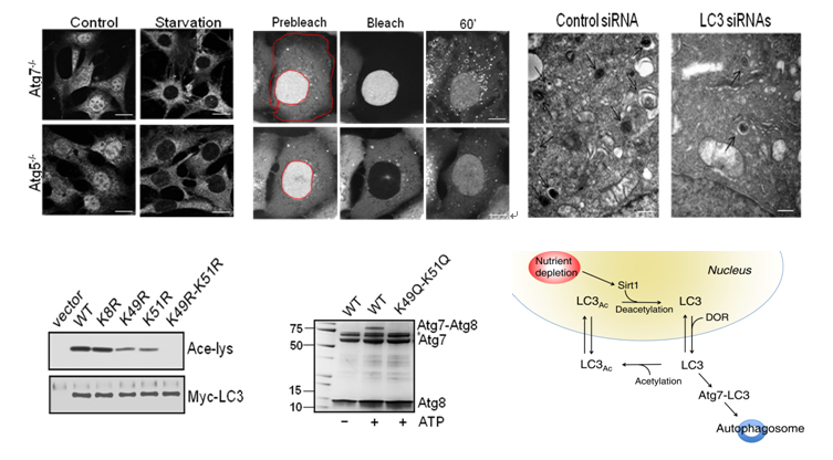 自噬泡的形成调控机制是细胞自噬研究的重要内容,LC3蛋白在自噬前体的产生、自噬泡膜的延伸和自噬泡与溶酶体的融合中都发挥关键作用。自噬的重要过程都发生在细胞质中,但长期以来人们发现LC3在细胞核内有强烈分布,LC3定位于细胞核的意义和作用一直不清楚。刘伟教授研究组发现:生理情况下LC3以乙酰化形式存在于细胞质和细胞核,在诱导自噬发生时,位于胞核内的LC3在第49位和51位赖氨酸被激活的脱乙酰化酶Sirt1脱乙酰化,脱乙酰化的LC3与DOR蛋白结合,被转移至核外。胞质中只有脱乙酰化的LC3才能与Atg7等蛋白发生相互作用,完成类泛素化修饰并结合至自噬泡膜,从而发挥其在自噬中的关键作用。该机制揭示了LC3存在于细胞核的意义,阐明乙酰化/脱乙酰化通过决定LC3蛋白的空间定位和类泛素化修饰,调控自噬发生启动的分子机制。