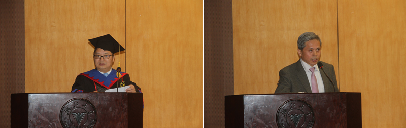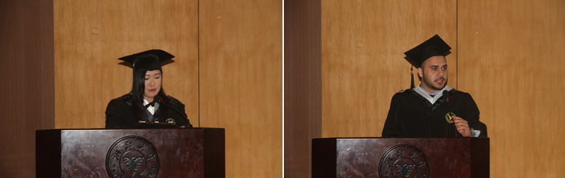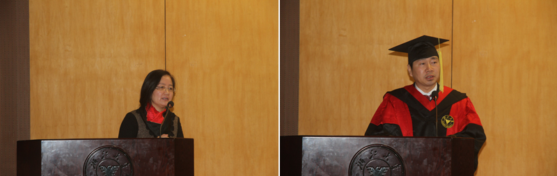毕业典礼由副院长方向明主持,常务副校长宋永华、院长段树民、常务副院长陈智、副院长欧阳宏伟、国际教育学院副院长刘辉、副院长沈华浩、副院长李晓明、留学生教育科科长樊立洁等领导出席典礼。宋永华在毕业典礼上讲话,寄语同学们“作为一名合格的医生,不仅需要从书本中获得的知识,还需要技术、经验、态度、热情,更需要一颗仁心,这是需要大家今后共同努力的目标。” 随后,段树民和刘辉分别致辞,对毕业生顺利完成学业表示热烈的祝贺,并提出了殷切的希望。学生代表Joan Lim Ai Hui 和 Mahmoud kahlaf 的发言,赢得了大家一阵阵的掌声。