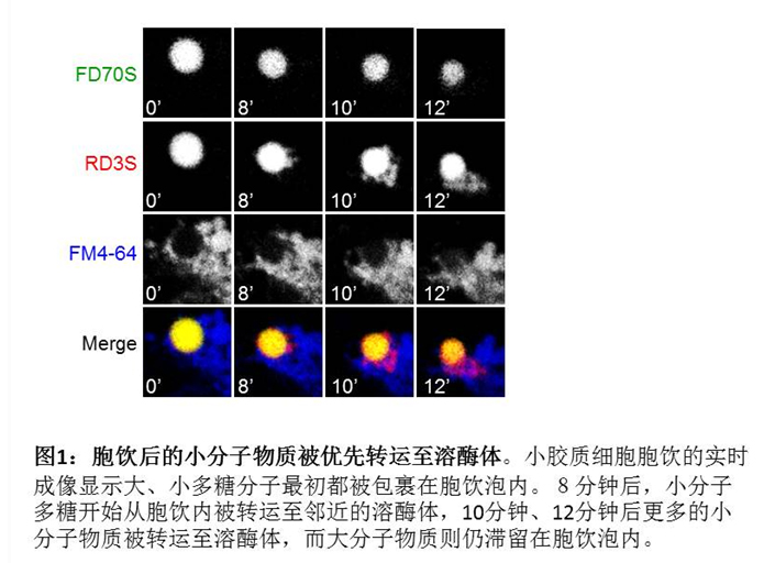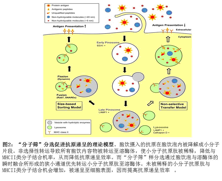 “A novel size-based sorting mechanism of pinocytic luminal cargoes in microglia”。该研究首次发现小胶质细胞的胞饮(pinocytosis)活动存在一种“分子筛”机制,能优先转运小分子抗原至溶酶体 (图1);并促进抗原富集及其与MHCII类分子的结合,从而提高抗原递呈效率(图2)。