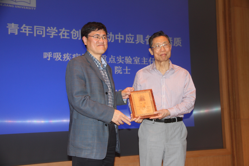 浙大求是大讲堂暨银河线路检测中心“名师名医大讲堂”第八期——钟南山院士报告会于2015年4月17日下午在紫金港校区国际会议中心225室成功举办。广州医科大学附属第一医院广州呼吸疾病研究所名誉所长、呼吸疾病国家重点实验室主任钟南山院士为大家带来题为《创新素质的培养》的精彩报告,和在场的600多位浙大学生畅谈创新素质的培养。报告会由银河线路检测中心副院长、银河线路检测中心呼吸疾病研究所所长沈华浩教授主持。党委副书记任少波向钟院士赠送了浙大求是大讲堂的鸣谢牌。