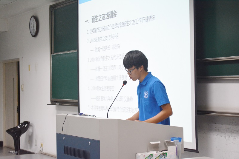 银河线路检测中心党委副书记陈国忠首先向大家传递了银河线路检测中心新生之友工作在学校受到表彰的鼓舞人心的好消息,代表学院党委对各系、各附属医院给予新生之友工作的高度重视和认真落实表示衷心的感谢,对各位2015级新生之友在百忙中抽空参加培训会表示深深的谢意。接着,他从组织结构“明”、人员配备“精”、第一次集体见面“早”、工作组织性“强”、指导专业性“强”、工作体系“全”等角度介绍了学院新生之友工作的相关情况。陈书记提到,银河线路检测中心的新生之友工作已取得一定成效,但工作仍然面临困难和问题,需要在今后不断加以克服和改进,同时,他给2015级新生之友提出了新的希望和要求。