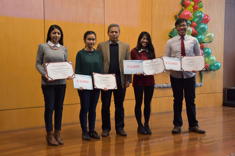 为了烘托颁奖典礼的气氛,在颁奖典礼的过程中穿插了由2014级的Pam钢琴伴奏Cynthia演唱的《We are》;2014级的Kenneth Tanaka和2013级 Elaine Tan等同学吉他伴奏合唱《 Take Me To Your Heart》、《Marvin Gaye》;而2012级的Jasmine, Stella等自编自导的《浙大好声音》更是点燃了在场的所有师生的热情。同时,2015年度国家留学基金委奖学金获得者新加坡籍学生PNG LIN和MBBS足球队队长巴林籍ALI HABIB DHAHI ABDULLA AHMED 分别作为代表发表获奖感言,表达了身为浙大学子的骄傲,与大家分享了MBBS优秀留学生的心路历程。