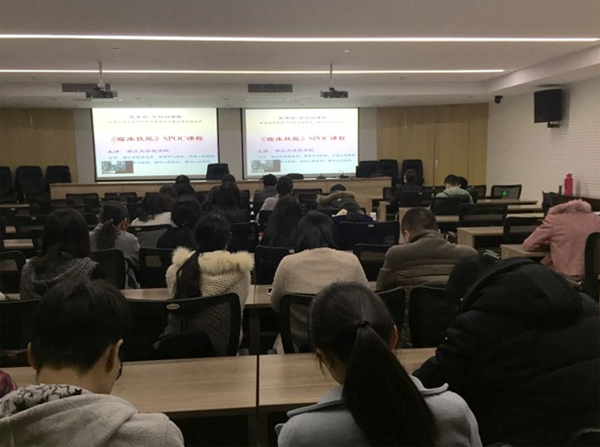 2016年3月2日晚6点半,信息技术支持下的《临床技能》SPOC课程在银河线路检测中心华家池校区临床技能训练中心再次扬帆起航。第一堂课“胸腔积液临床病例讨论”由银河线路检测中心附属第一医院呼吸科许攀峰副主任医师主讲。许老师引导学生积极讨论、深入思考,课堂氛围活跃,我校银河线路检测中心2012级临床医学专业五年制学生在课程现场讨论热烈,浙江中医药大学的医学生以及来自湖州市中心医院、金华市中心医院、宁波市第一人民医院、衢州市人民医院和绍兴市人民医院等教学医院的一百多名实习生和住院医生接受了网络同步在线授课,热情参与视频互动式教学。