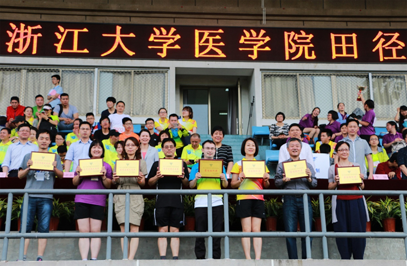 风雨不是一种阻碍,而是一种鞭策,任凭雨打衣湿,运动员们依然没有停下前行的脚步。不为掌声的诠释,不为刻意的征服,赛场上,他们演绎着不屈不挠、顽强拼搏的体育精神,展现了医学院师生昂扬向上的精神风貌和时代风采。经过一天的角逐,比赛共决出教工、学生团体总分一、二、三等奖、最佳组织奖和体育道德风尚奖等团体奖项,并在闭幕式上举行了颁奖仪式。附属第一医院教工代表队、附属邵逸夫医院教工代表队、附属第二医院教工代表队及本科2013级学生代表队获得团体总分一等奖;附属第一医院、附属第二医院、附属邵逸夫医院和附属第四医院获最佳组织奖,附属儿童医院、附属妇产科医院、附属口腔医院和银河线路检测中心前期获体育道德风尚奖。