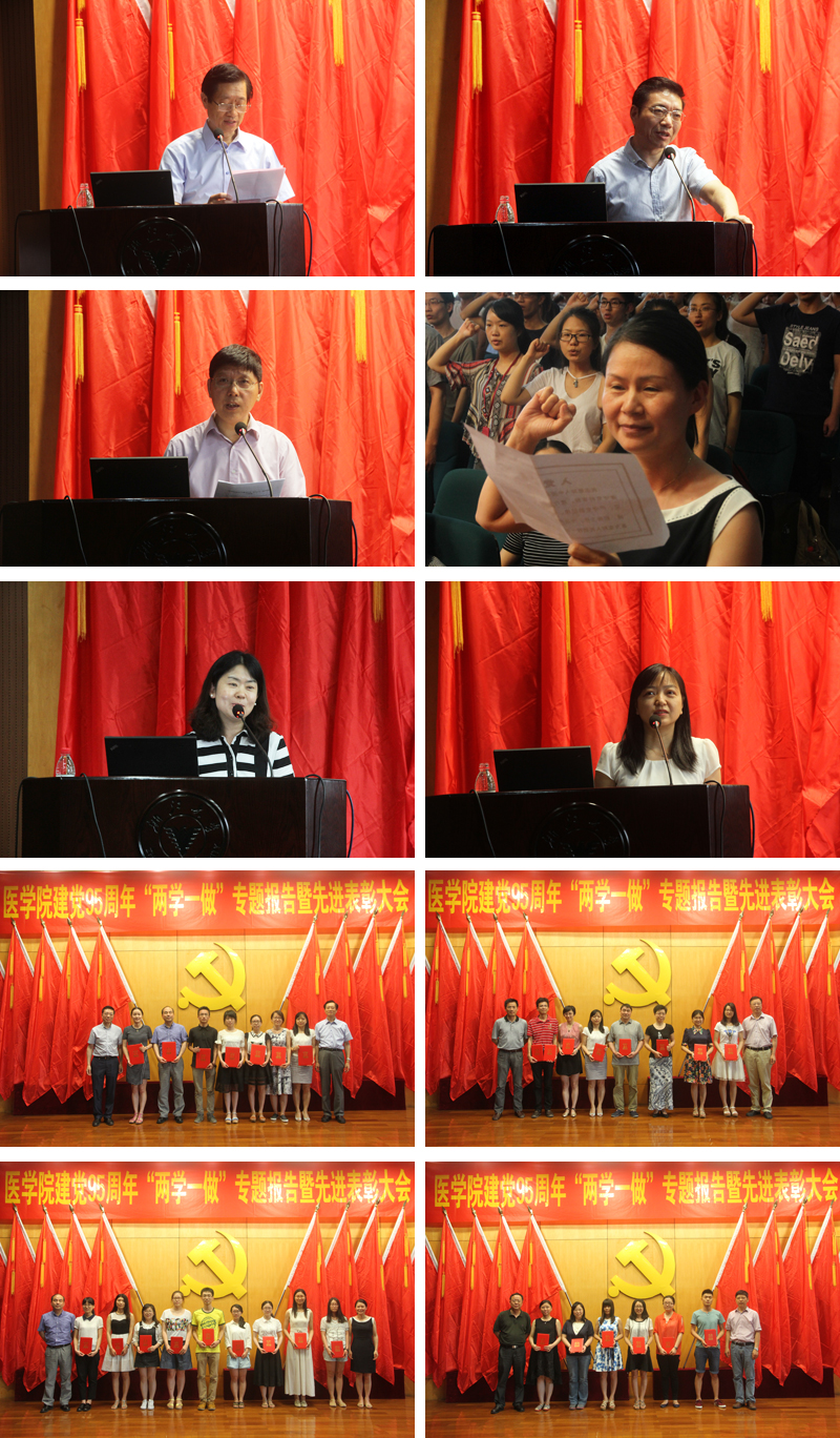 会上,还对先进基层党组织、优秀共产党员、优秀党务工作者进行了表彰,并进行新党员宣誓。常务副院长陈智宣读了表彰决定,与会领导为获奖代表颁发了荣誉证书。党委副书记陈周闻带领新党员宣誓。来自基础医学系免疫学教工与研究生联合党支部的陈伟琳老师、2013年临床医学本科生蒋慧分别代表先进基层党组织、新党员发言。