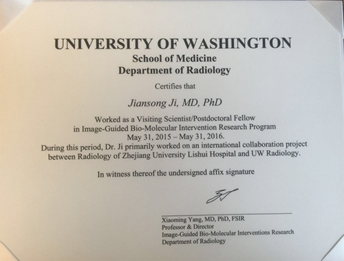 纪建松在美国学习期间的研究课题是《miR-126靶向Spred1促进肝癌介入栓塞后血管生成的实验研究》。实验计划临床上搜集手术切除、手术切除+TACE、癌旁组织的肝癌标本,通过qRT-PCR和Western blot定量测定miR-126的表达、Spred1及VEGF,并通过免疫组化测定标本微血管密度(MVD),对比三组差异,揭示MicroRNA-126基因靶点与Spreds 1蛋白表达的相关性。导师杨晓明是华盛顿大学终身教授和影像引导介入研究室主任,一直致力于联合介入放射学和分子影像学技术的相关研究,并首先提出了介入分子影像学的概念。