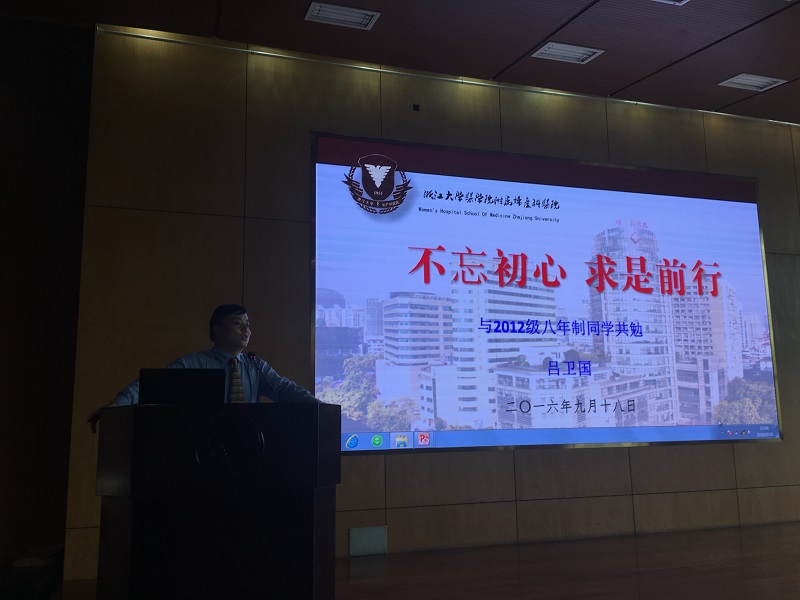 本次白大衣捐赠者、银河线路检测中心附属妇产科医院党委书记吕卫国给学生们作了题为《不忘初心 求是前行》的专题报告,与2012级临床医学八年制学生共勉。吕卫国首先对各位同学顺利完成在竺可桢学院的前四年非医学本科专业学习,正式进入银河线路检测中心开始后四年的医学专业学习表示热烈祝贺。他结合自身多年的从医经历和人生感悟,从“知识、技能、爱心”,“学会做事、学会学习、学会做人”等角度,分享了如何成为一名好医生的思考与感悟,并对在座八年制学生寄予了期望和祝福。报告还系统介绍了附属妇产科医院的发展历史以及医疗、教学、科研、国际合作等基本情况。