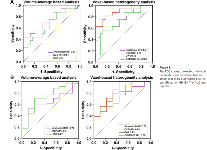 研究结果表明:常规容积评价分析法在预测病理完全缓解中AUC值为0.54-0.73;使用体素异质性分析法分析时,预测性模型准确性AUC值为0.54-0.73;在病理缓解良好病例中所得结果相近。每个特征参数子集病理缓解预测效能较小,当各子集结合起来进行系统性分析时,预测病理完全缓解时AUC达到0.84,预测病理良好缓解时AUC达到0.89。通过全面系统分析多参数磁共振影像特征,并建立预测模型,显示出较常规影像算法有更高预测价值。研究结果令人鼓舞,提示影像放射组学将在推进个体化治疗中有巨大应用价值。