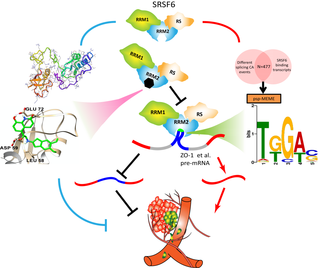 该研究在本课题组前期研究lncRNA LINC01133通过结合可变剪接因子SRSF6,抑制结直肠癌EMT和转移(Kong J, Sun W, Li C, Wan L, Wang S, Wu Y, Xu E, Zhang H*, Lai M*. Long non-coding RNA LINC01133 inhibits epithelial-mesenchymal transition and metastasis in colorectal cancer by interacting with SRSF6. Cancer Lett. 2016,380:476-84)的工作基础上,发现SRSF6在结直肠中异常高表达并且与病人的预后相关。体外研究发现,SRSF6能够促进结直肠癌细胞的增殖与迁移侵袭。RNA测序和生物信息学鉴定了SRSF6下游的可变剪接靶点及作用机制,其中紧密连接蛋白ZO-1第23号外显子的可变剪接是SRSF6的重要靶点之一。体内动物实验也发现异常表达的SRSF6通过调控ZO-1 RNA第23号外显子异常剪接促进结直肠癌的发生和转移。最后课题组通过对SRSF6蛋白同源建模发现治疗慢性阻塞性肺疾病的药物茚达特罗能够在较低剂量下结合并抑制SRSF6的剪接调控功能。在动物模型中,茚达特罗治疗结直肠癌实验显示较好的疗效。该研究通过全新的角度研究肿瘤发病机理,在详细阐明了结直肠癌中异常可变剪接机制,秉承“老药新用”的理念,通过交叉学科进行药物虚拟筛选发现了慢性阻塞性肺疾病药物具有抗结直肠癌作用。