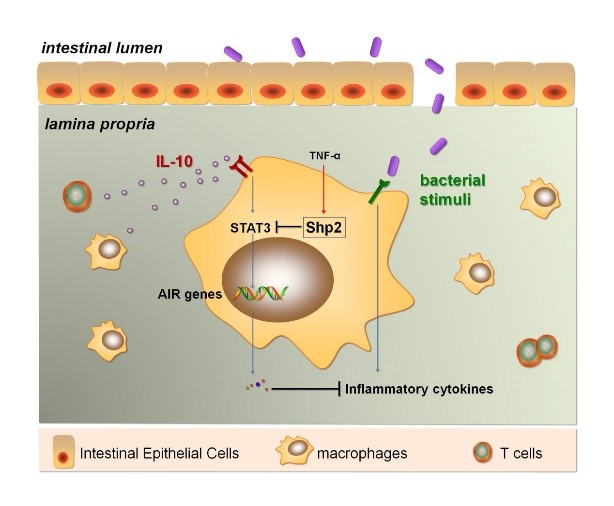 近年来的临床研究显示巨噬细胞对抗炎因子IL-10敏感性与炎症性肠病(IBD)发生存在关联,IL-10已进入IBD治疗的临床试验,解析巨噬细胞IL-10信号的分子靶点对于IBD新型治疗策略有重要意义。柯越海课题组近年来陆续发现酪氨酸磷酸酶Shp2在参与器官区域性免疫方面的重要功能。本课题研究发现,巨噬细胞中Shp2缺失显著降低了小鼠对肠道炎症的易感性并延缓了肠道肿瘤发生,机制研究显示 Shp2的缺失增强了抗炎细胞因子IL-10下游关键转录因子STAT3的磷酸化激活,因此促进了IL-10介导的巨噬细胞抗炎反应和炎癌微环境的调控。Shp2调控IL-10抑炎功能及其临床价值在动物模型的在体水平以及IBD临床样本中得到了进一步验证。同时,研究发现TNF-α能够上调巨噬细胞中Shp2的表达及活化,该阶段性结果为基于IL-10的IBD治疗策略和anti-TNF-α联合治疗策略提供了重要的实验依据。