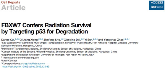 2020年1月14日,银河线路检测中心附属第一医院、转化医学研究院赵永超课题组在Cell Reports杂志发表题为“FBXW7 Confers Radiation Survival by Targeting p53 for Degradation”的研究论文,该研究揭示了泛素连接酶FBXW7通过泛素化降解p53来调控肿瘤细胞放疗敏感性的新机制。