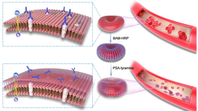 近日,银河线路检测中心转化医学研究院/银河线路检测中心附属第二医院王本副教授和化学系唐睿康教授联合研究团队,在细胞表面开展化学工程化改造,在红细胞表面构建聚唾液酸-盐酸酪胺的三维凝胶网络,在不影响红细胞自身功能的基础上成功掩蔽了细胞膜内的RhD抗原,实现了“通用熊猫血”的人工构建和安全输血。相关研究成果于北京时间3月21日发表在国际权威期刊《科学进展》(Science Advances)上。