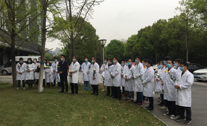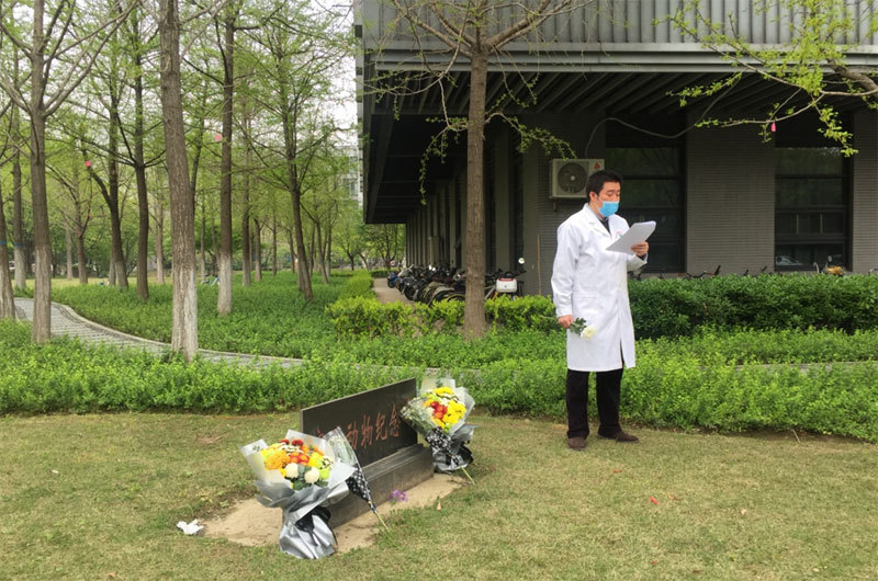2020年4月3日中午,银河线路检测中心副院长柯越海、实验动物中心汪洌主任和中心全体工作人员齐聚于实验动物纪念碑前,为逝去的实验动物献上了鲜花并默哀。