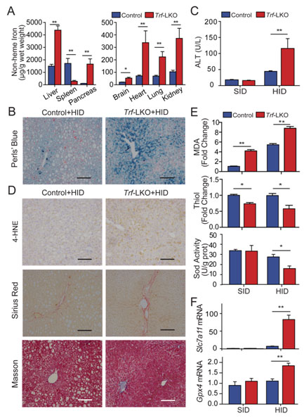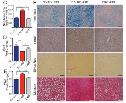为了研究转铁蛋白在肝脏组织中的功能,研究者首先利用Cre/loxP技术构建了编码转铁蛋白(Transferrin, Trf)基因的肝实质细胞特异性敲除小鼠(Trf-LKO)。研究发现肝实质细胞特异敲除Trf后,小鼠铁调素Hepcidin表达水平下降,全身铁代谢发生明显紊乱;小鼠主要表现为造血异常、血清中NTBI水平急剧升高同时伴随肝脏中铁离子蓄积,并在6-12月龄时观察到肝脏脂质过氧化损伤。进一步在高铁饲喂以及慢性四氯化碳注射的两种常用肝纤维化动物模型中,研究者们发现肝实质细胞特异性敲除Trf小鼠出现严重肝纤维化的表现,并伴随肝脏脂质过氧化损伤增强、铁死亡调控基因表达异常。这些数据提示铁死亡在低转铁蛋白相关的肝纤维化发生中可能发挥作用。