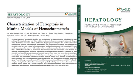 【4】 Hao Wang, Peng An , Enjun Xie, Qian Wu , Xuexian Fang , Hong Gao, Zhuzhen Zhang, Yuzhu Li, Xudong Wang, Jiaying Zhang , Guoli Li, Lei Yang, Wei Liu, Junxia Min*, Fudi Wang*(王福俤). Characterization of ferroptosis in murine models of hemochromatosis. Hepatology 2017; 66:449-465.