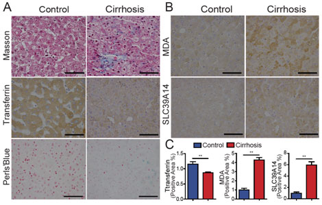 小鼠的这些系列发现是否与临床相关疾病有关?为了进一步探究临床患者转铁蛋白与肝纤维化关联特征,研究人员通过分析肝硬化患者和正常健康对照的血清学指标,发现肝硬化患者的血清转铁蛋白水平显著低于健康对照人群;并且肝硬化患者的肝纤维化四项与血清转铁蛋白水平之前存在显著负相关。这些临床相关分析进一步提示转铁蛋白缺乏在肝纤维化/肝硬化的发生发展中可能扮演重要角色。此外,基于肝硬化患者的肝穿样本的检测结果,发现肝硬化患者的肝脏转铁蛋白水平明显减少,而肝脏铁水平及SLC39A14蛋白表达水平明显增高,进一步表明转铁蛋白缺乏的肝纤维化/肝硬化患者可能通过SLC39A14吸收NTBI,随后激发了脂质过氧化性肝损伤、肝纤维化及肝硬化。这些数据提示抑制铁死亡或SLC39A14有望成为潜在的防治肝硬化的治疗方式。