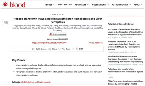 【1】Yingying Yu#, Li Jiang#, Hao Wang, Zhe Shen, Qi Cheng, Pan Zhang, Jiaming Wang, Qian Wu, Xuexian Fang, Lingyan Duan, Shufen Wang, Kai Wang , Peng An, Tuo Shao, Raymond T Chung, Shusen Zheng*, Junxia Min*, Fudi Wang*(王福俤).Hepatic Transferrin Plays a Role in Systemic Iron Homeostasis and Liver Ferroptosis. Blood. doi: 10.1182/blood.2019002907. Online ahead of print.