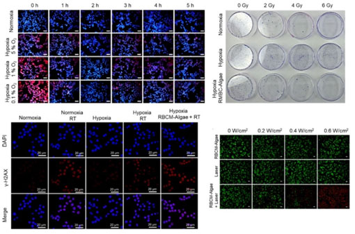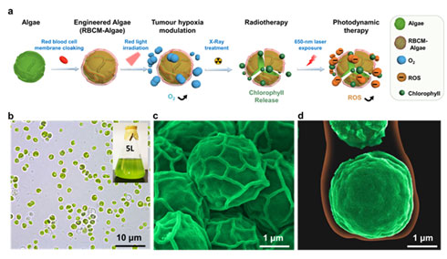 (光照下,微藻快速产氧来改善癌细胞的乏氧状态;在X射线照射下高效破坏癌细胞的DNA,实现放射治疗增敏效果;随后释放出来的叶绿素可以实现联级光动力治疗。)