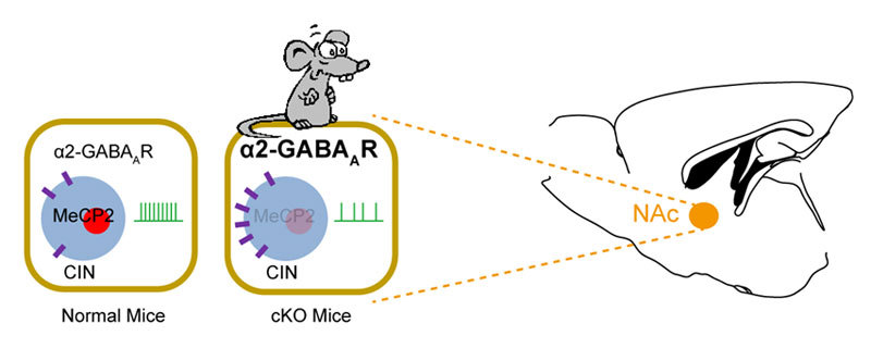 为了解决这一科学问题,李晓明教授团队的研究生首先发现在小鼠胆碱能神经元(cholinergic neurons)中特异性敲除MeCP2蛋白能够引起小鼠恐惧学习能力的降低。并且,在伏隔核(Nucleus Accumbens)特异性恢复MeCP2表达能够恢复小鼠的恐惧学习能力,而不是基底前脑。这表明伏隔核的胆碱能中间神经元中MeCP2蛋白缺失导致敲除小鼠恐惧学习能力的降低。