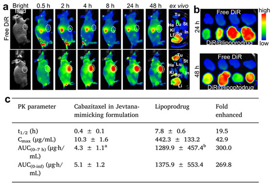 图2.卡巴他赛前药脂质体的体内分布和药代动力学研究。a. 载DiR荧光素的卡巴他赛前药脂质体在DU145移植瘤小鼠的活体成像图。b. 给药后24 h和48 h的肿瘤药物积蓄。c. 临床卡巴他赛注射液和前药卡巴他赛脂质体的药代动力学参数。