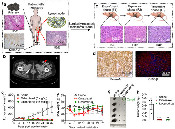 图3.黑色素肿瘤病人来源的移植瘤(PDX)模型的建立以及前药脂质体在该模型中的疗效评估。a. 黑色素病人原位瘤和淋巴结转移灶的H&E和IHC染色。b. 黑色素病人骨盆CT。c. PDX 模型的建立以及1代,2代,3代肿瘤的H&E染色。d. 第三代PDX模型肿瘤的melan-A以及S100-β 染色。e. 不同给药方式后的裸鼠肿瘤体积变化。f. 给药后裸鼠体重变化。g. 治疗结束后各组肿瘤照片。h. g图中各组肿瘤的重量。