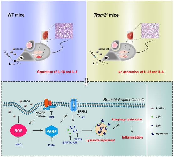 在本研究中,研究者通过支气管灌注C57BL/6野生型(WT)小鼠构建了SiNPs引发肺部炎症的动物模型,发现暴露组小鼠支气管肺泡灌洗液中的细胞因子水平、蛋白浓度、乳酸脱氢酶释放和炎性细胞浸润均显著升高,证实SiNPs暴露引发小鼠肺部炎症。已知肺支气管上皮细胞是纳米材料肺损伤的首要接触细胞,为此,研究者使用人支气管上皮细胞观察了SiNPs 的体外毒性效应,发现经SiNPs 暴露后细胞活力明显下降,炎症水平则明显升高,这一结果与体内结果一致。进一步的研究发现,SiNPs 可以引起细胞内ROS生成明显增加,进而激活PARP-1产生TRPM2通道激动剂ADPR,并引发TRPM2 通道开放介导胞内Zn2+和Ca2+水平的升高,由它们协同导致溶酶体碱化和溶酶体膜通透性改变,破环溶酶体功能,进而阻断正常细胞自噬过程并引发炎症反应。最后,研究发现SiNPs灌肺处理后,TRPM2敲除小鼠的肺部炎症水平显著低于野生型小鼠,而且TRPM2敲除小鼠的肺损伤也显著减轻,从而在动物水平进一步表明ROS/PARP-1/TRPM2信号通路在SiNPs引发的肺部炎症过程中发挥的重要功能。