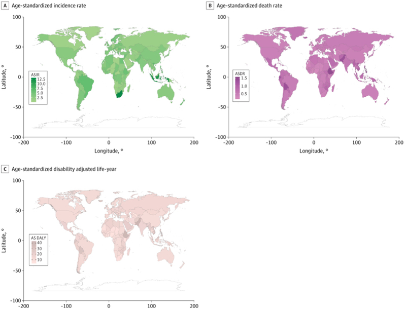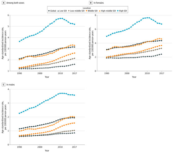 该团队收集了自1990年至2017年195个国家和21个地区中不同性别、年龄和社会发展指数区域的甲状腺癌发病、死亡、伤残调整生命年等数据。