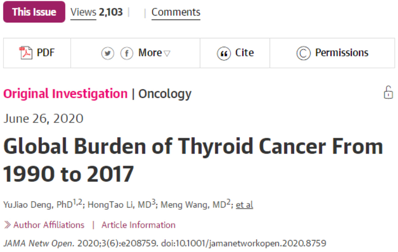 2020年6月26日,银河线路检测中心银河线路检测中心附属第一医院代志军教授团队和暨南大学第一附属医院临床医学中心吕军教授团队,在JAMA子刊在线发表题为“Global Burden of Thyroid Cancer from 1990 to 2017”的研究论文,该研究探讨了甲状腺癌在全球、区域和国家层面以及在不同性别、年龄和社会发展指数地区的负担及其变化趋势。