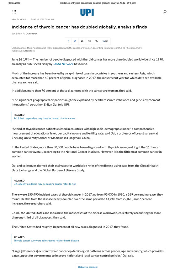 论文发表当日,美国著名传媒United Press International(UPI)的Health News对代志军教授进行了专题采访。甲状腺癌发病率及死亡率在全球范围内呈上升趋势,这意味着全球医疗保健系统将承受更大的甲状腺癌负担,女性和社会发展指数较高的国家甲状腺癌负担更重。研究中甲状腺癌流行病学模式在性别、年龄、社会发展指数、区域和国家之间存在较大的异质性,反映了相应的遗传和环境风险因素,经济教育水平,生活方式以及获得医学筛查和治疗的机会方面的差异,为政府改进国家和地方癌症控制政策提供了数据支持。