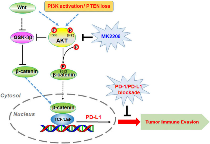 肿瘤细胞逃避免疫系统攻击的手段多样,其中较为常见的是产生一个不利于免疫细胞发挥杀伤作用的微环境和上调自身免疫抑制分子的表达水平等。PD-L1是由CD274编码的免疫抑制分子,它能通过与T细胞表面的PD-1结合,并导致T细胞的增殖、激活和杀伤能力等受到抑制。大量文献报道在肿瘤中PD-L1的表达水平显著高于癌旁组织,同时PD-L1水平越高也预示着更为糟糕的预后。吕志民与吕建新团队发现胶质瘤标本中激活的-catenin水平与PD-L1表达水平呈正相关,而与肿瘤组织中浸润的CD8+T细胞数呈负相关;进一步研究发现Wnt通路和EGFR通路激活均可促使-catenin激活,随后-catenin与TCF/LEF形成复合物并结合到CD274基因的启动子上,从而引起PD-L1的表达水平升高;同时,研究人员还发现AKT介导了Wnt通路和EGFR通路对-catenin/CD274的调控作用,故在后续的研究中,他们将PD-1抗体与已进入临床二期的AKT抑制剂MK2206联合用药治疗小鼠同种原位GBM模型,研究表明联合用药不但能更有效地促进肿瘤中CD8+T细胞的浸润水平,同时还能更显著地延长荷瘤小鼠的生存期。该研究揭示的分子机制简图如下所示: