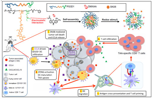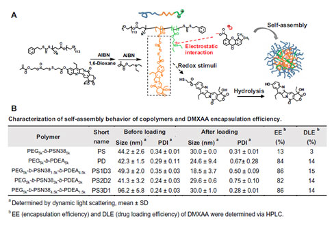 研究团队合成了肿瘤微环境响应性PS3D1@DMXAA的三嵌段共聚物纳米粒子,同时将化疗药物伊利替康的活性代谢产物SN38和STING激动剂DMXAA共输送到肿瘤中(图1)。