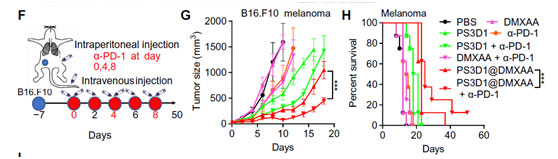 图4.PS3D1@DMXAA纳米药物联合抗PD-1疗法延长黑色素瘤生存期
