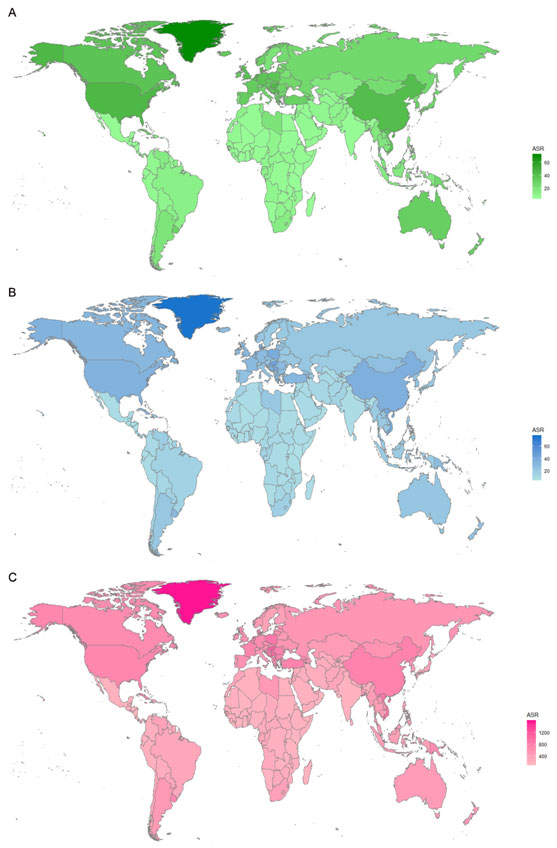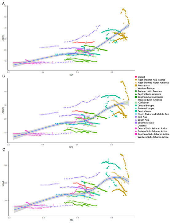 28年间,高SDI地区的肺癌发病率、死亡率和DALYs持续最高,而低SDI地区的持续最低。截至2017年,肺癌负担增长最快的是中SDI地区,增长最慢的是高SDI地区。2017年,高SDI地区的ASIR最高,低SDI地区的ASIR最低。从1990到2017年,ASDR或年龄标准化DALY率最高的地区由高SDI地区转变为中高SDI地区,但其在低SDI地区保持最低。肺癌ASRs在高SDI地区下降最快,在低SDI地区增长最快。肺癌ASIR仅在高SDI地区呈下降趋势,ASDR在高、高、中SDI五组中均呈下降趋势。除低SDI地区外,各SDI地区的年龄标准化DALY率均呈下降趋势。