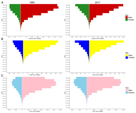 图2 1990和2017年全球肺癌的发病率、死亡率及DALY率的年龄、性别分布