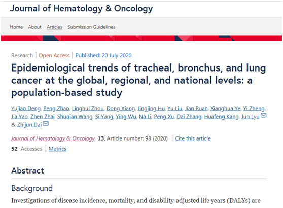 2020年7月20日,银河线路检测中心附属第一医院代志军教授团队和暨南大学第一附属医院临床医学中心吕军教授团队,在美国华裔血液及肿瘤专家学会会刊Journal of Hematology&Oncology(JCR一区,2019年影响因子:11.059)在线发表题为“Epidemiological trends of tracheal, bronchus, and lung cancer at the global, regional, and national levels: a population-based study”的研究论文,该研究探讨了肺癌及其预后风险因素在全球、区域和国家层面以及在不同性别、年龄和社会发展指数地区的负担及其变化趋势。