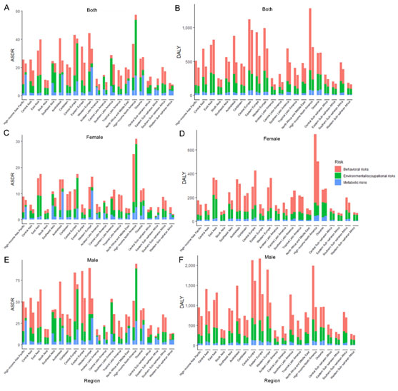 男性中,日常行为风险相关的肺癌ASDR及年龄标准化DALY率在东亚增加最快,而在高收入的北美地区下降最快; 就女性而言,其在中欧地区的增幅最大,而高收入的北美地区的降幅最大。与环境/职业风险相关的ASDR和年龄标准化DALY率普遍下降。除东亚地区外,其他地区男性的环境/职业风险相关肺癌的ASDR均呈下降趋势;对女性而言,其在南亚、拉丁美洲南部、西欧、中欧和澳大利亚都有所增加,但在其他地区均有所减少。