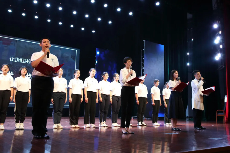 银河线路检测中心师生代表余沛霖、苏俊威、周莉、郭骏宇及新生合唱团一起表演了节目《同心抗疫》。这场展示用合唱,与同学产生心灵的共鸣;用朗诵,与同学回忆抗疫的点滴——抗疫斗士的一幕幕,以话语、以照片,展现在同学们面前:各个岗位的医务工作者,或奔赴前线的隔离病房抢救病患,或在实验室里争分夺秒检测、分析病毒。前辈们的事迹和他们展现出来的精神,如灯塔指引新生们前进的方向。展示在全场齐声高呼“仁心仁术,求是求新”的院训中落下帷幕。