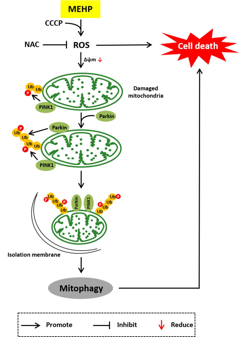 线粒体自噬(Mitophagy)是指自噬小体包裹受损或多余线粒体运送至溶酶体进行降解的生物学过程。该研究团队发现,MEHP的单独暴露本身并不足以诱导经典的线粒体自噬,但当线粒体经由低剂量(同样不足以诱导线粒体自噬)的羰基氰化物间氯苯腙(CCCP)暴露后,加以MEHP联合暴露(“MEHP-CCCP”)可诱导线粒体超氧化物ROS大量增加、线粒体膜电位下降、线粒体分裂增加,提示线粒体在MEHP与低剂量CCCP联合作用下发生了损伤。线粒体在发生损伤后,细胞启动线粒体自噬以清除受损线粒体。MEHP-CCCP促进线粒体自噬的重要激酶PINK1在线粒体外膜聚集,进而磷酸化泛素分子(Ub)和Parkin蛋白,Parkin蛋白随后聚集在线粒体外膜并发生泛素化。而Parkin本身作为一种E3泛素连接酶,活化后可以促进线粒体相关蛋白的泛素化,最终导致线粒体自噬的发生,表明MEHP-CCCP诱导的线粒体自噬依赖于PINK1-Parkin信号通路。有趣的是,在本研究的暴露模型中,课题组发现抑制线粒体自噬可以促进细胞的存活,并且线粒体ROS介导了MEHP-CCCP诱导的线粒体自噬及细胞毒性。综上所述,本研究首次报道了MEHP通过调控PINK1/PARKIN介导的经典线粒体自噬途径促发的毒效应机制,并阐明了线粒体ROS在其中发挥的关键作用。该研究为更好地了解塑化剂类环境内分泌干扰物的毒作用机制,以便优化及合理使用此类化合物提供了重要的科学依据。
