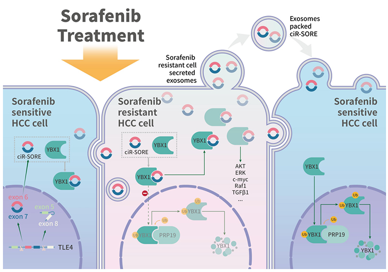 研究团队发现circRNA-SORE表达水平在耐药肝细胞肝癌细胞株中显著升高,而抑制其表达可以显著增强索拉非尼对肿瘤细胞的杀伤作用。进一步研究发现,circRNA-SORE通过结合YBX1蛋白,将其相对稳定在细胞质中,从而减少YBX1在细胞核中由PRP19介导的泛素化降解。更重要的是,研究团队发现circRNA-SORE可以通过外泌体在细胞间传播,介导非耐药细胞获得耐药性。这一发现不仅为肝细胞肝癌靶向治疗耐药的干预靶点提供了理论依据,更提供了预判耐药人群较稳定的生物标志物,有望在今后的临床实践中得到更广泛的应用。