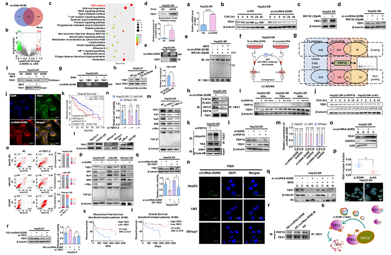 图3. circRNA-SORE通过结合YBX1,减少其在细胞核中被RPR19降解,而促进肝癌索拉非尼耐药