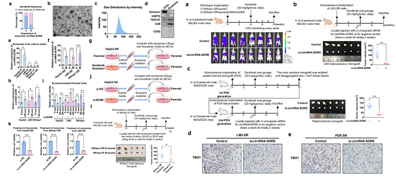 图4. 体内及体外实验发现circRNA-SORE可通过外泌体在细胞间传递索拉非尼耐药性,敲减circRNA-SORE可以显著使肝癌对索拉非尼增敏